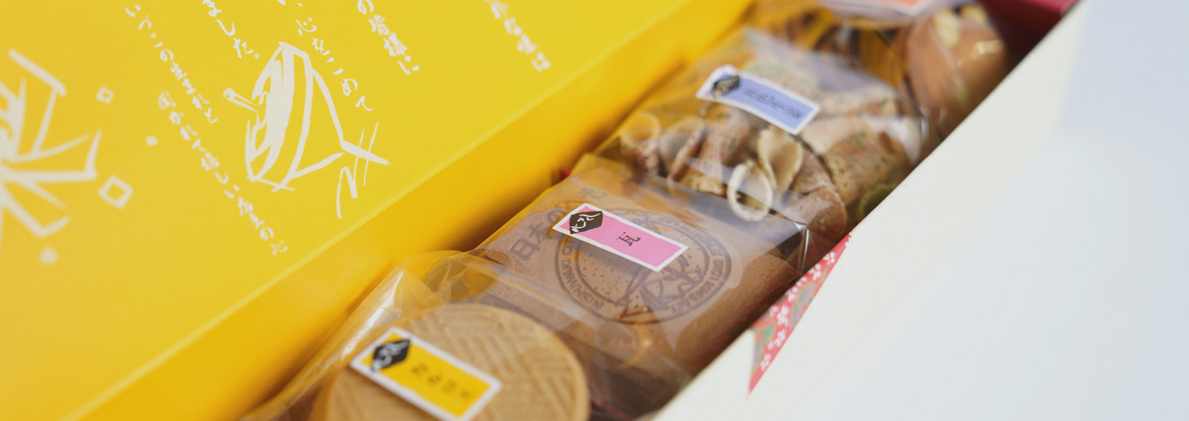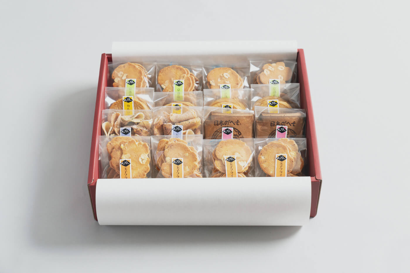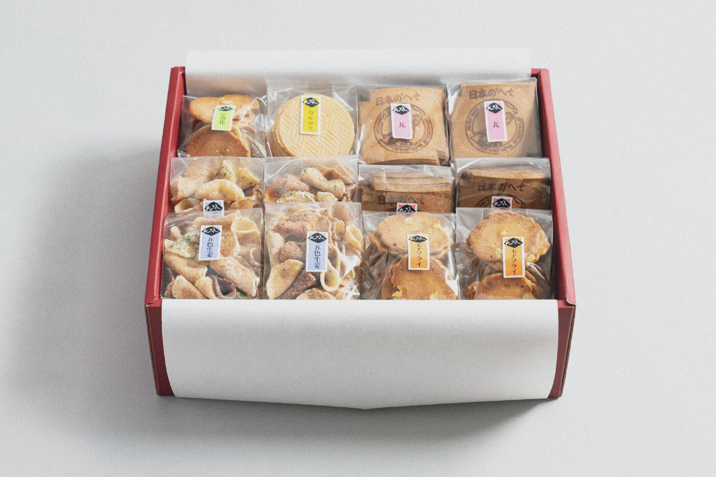名物「瓦せんべい」、ピーナツ入り「京落花」、薄焼き炭酸せんべい「カルロス」、フライビンズ入りせんべい「玉子フライ」、色とりどりの生姜せんべい「五色生姜」。